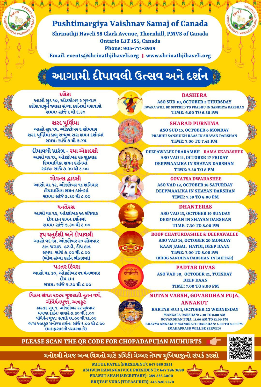 PMVSC is first of its kind of organization all over Canada that follows Shrimad Vallabhacharyaji Shri Mahaprabhujia's Shudhdhadwait Pushtimargiya beliefs. In 2001, PMVS successfully celebrated the festival of Chhak Mahotsav and Faag Mahotsav. All the vaishnava's of Toronto enjoyed these celebrations immensely. For many years after this, our Pushtimargiya satsang was conducted at the SMCC during the months of April, June, September and December. In addition, Shrimad Mahaprabhujia's Prakatyotsav is rejoiced in the Chaitra month of every year as well as Vraj Yatra is conducted since Vraj was inaugurated 20 year ago. Many Vallabhkul Acharyas visited Toronto each year and bless the Vaishnavs, conduct Vachanamrut and Padhramni at various vaishnava's residences to preach Pushtimarg and preserve Pushti Parinciples.